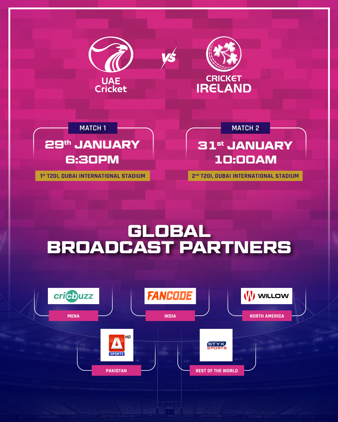 Dubai, 28 January 2026: The two-match UAE-Ireland T20I series will be broadcast around the world on some of the leading sports networks (TV and digital). The series will help both teams prepare for the ICC Men’s T20 World Cup which will be played in India and Sri Lanka from 7 February 2026 to 8 March 2026.