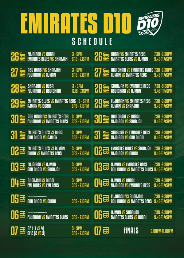 A total of 44 matches will be played during the tournament. At the conclusion of the league stage, the top four teams on the points table will advance to the semi-finals, culminating in a highly anticipated final. Over the years, the D10 tournament has produced thrilling contests. The list of previous winners reflects the competitive balance and growing depth of UAE cricket:
