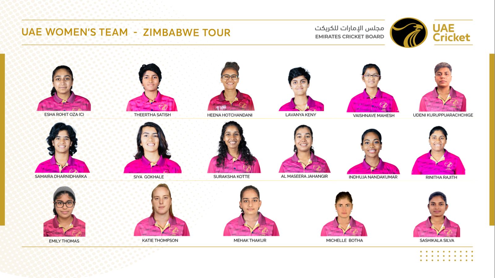 UAE Women’s squad for Zimbabwe tour: Esha Oza (captain), Al Maseera Jahangir, Emily Thomas, Heena Hotchandani, Indhuja Nandakumar, Katie Thompson, Lavanya Keny, Mehak Thakur, Michelle Botha, Rinitha Rajith, Samaira Dharnidharka, Siya Gokhale, Sashikala Silva, Suraksha Kotte, Theertha Satish (wicketkeeper) Udeni Kuruppuarachchige and Vaishnave Mahesh.