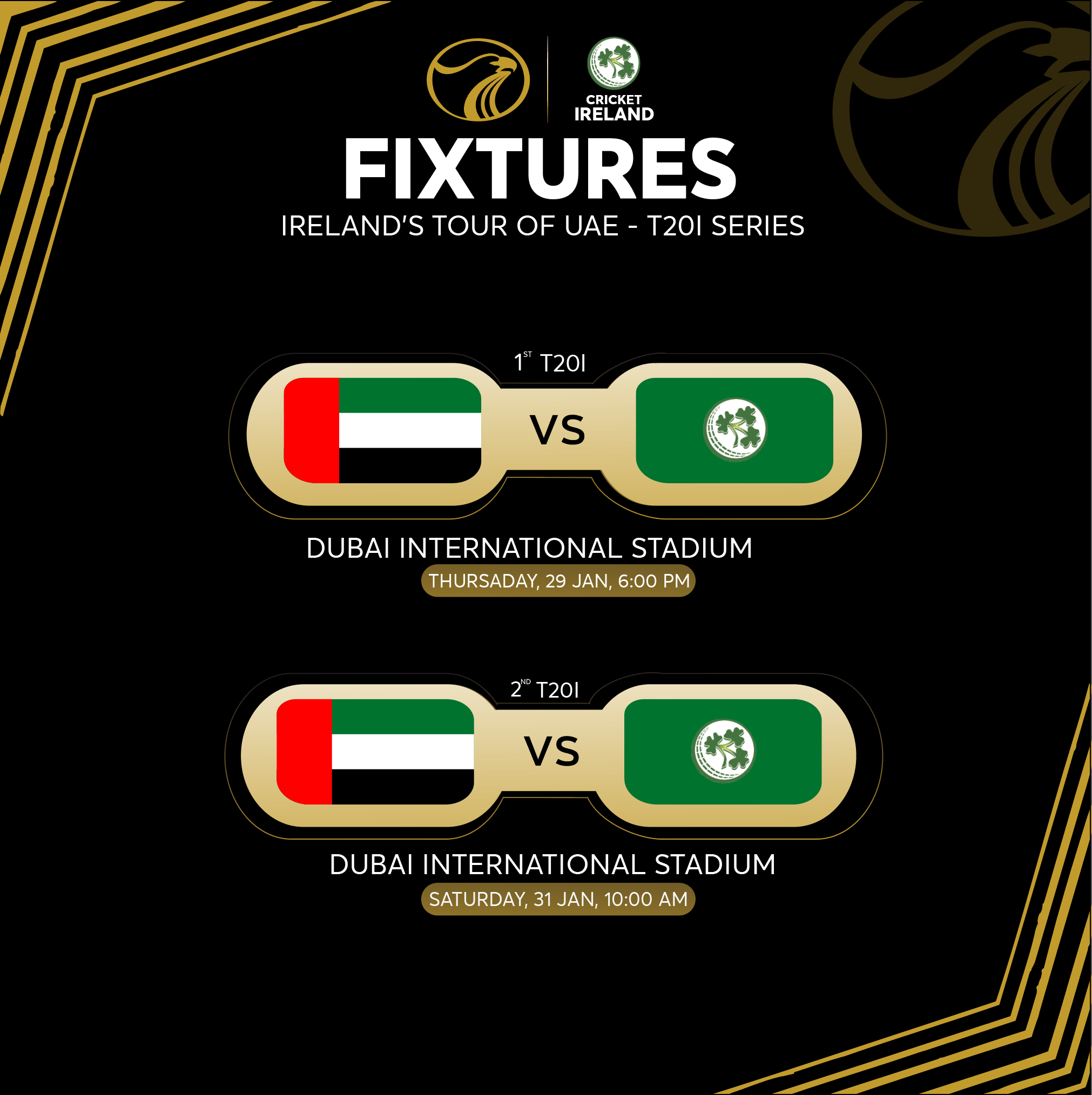 Dubai, 28 November 2025: UAE will host Ireland for a two-match T20I series in January 2026. The series will help both teams prepare for the ICC Men’s T20 World Cup which will be played in India and Sri Lanka from 7 February 2026 to 8 March 2026. Both matches will be staged at the Dubai International Stadium. The first match of the series will be played on Thursday, 29 January with the first ball to be bowled at 6:00pm local time.