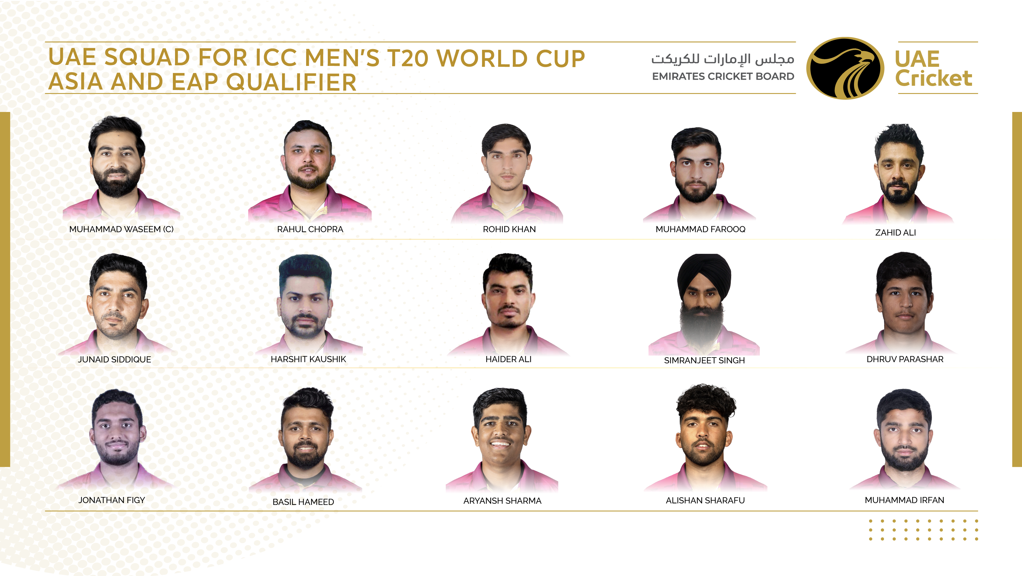 UAE squad for ICC Men’s T20 World Cup Asia and EAP Qualifier: Muhammad Waseem (captain), Alishan Sharafu, Aryansh Sharma (wicketkeeper), Basil Hameed, Dhruv Parashar, Jonathan Figy, Haider Ali, Harshit Kaushik, Junaid Siddique, Muhammad Farooq, Muhammad Irfan, Rahul Chopra (wicketkeeper), Rohid Khan, Simranjeet Singh and Zahid Ali.