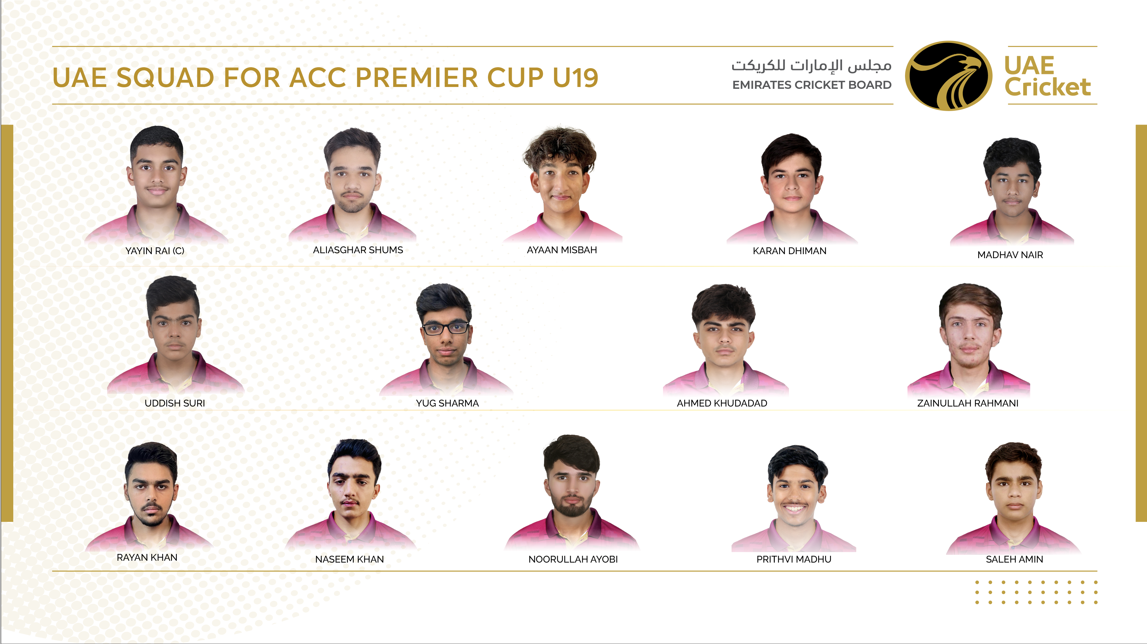 UAE squad for ACC Premier Cup U19: Yayin Rai (captain), Ahmed Khodadad, Aliasgar Shums, Ayaan Misbah, Karan Dhiman, Madhav Manoj, Naseem Khan, Noorullah Ayobi, Prithvi Madhu, Rayan Khan, Saleh Amin, Uddish Suri, Yug Sharma and Zainullah Rahmani.
